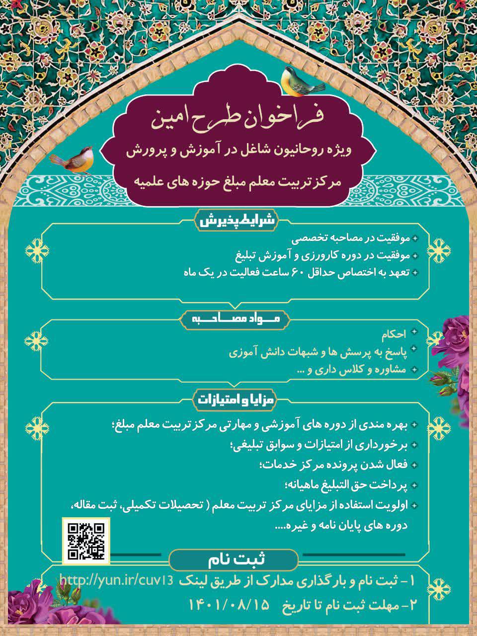 فراخوان ثبت نام طرح امین ویژه طلبه معلمان شاغل در آموزش و پرورش