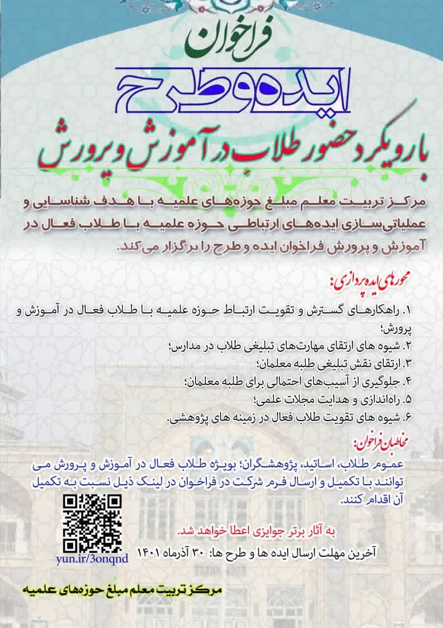 مرکز تربیت معلم مبلغ حوزه های علمیه با هدف شناسایی و عملیاتی سازی ایده های مناسب جهت ارتباط حوزه علمیه با طلاب فعال در آموزش و پرورش فراخوان ایده و طرح برگزار می کند.